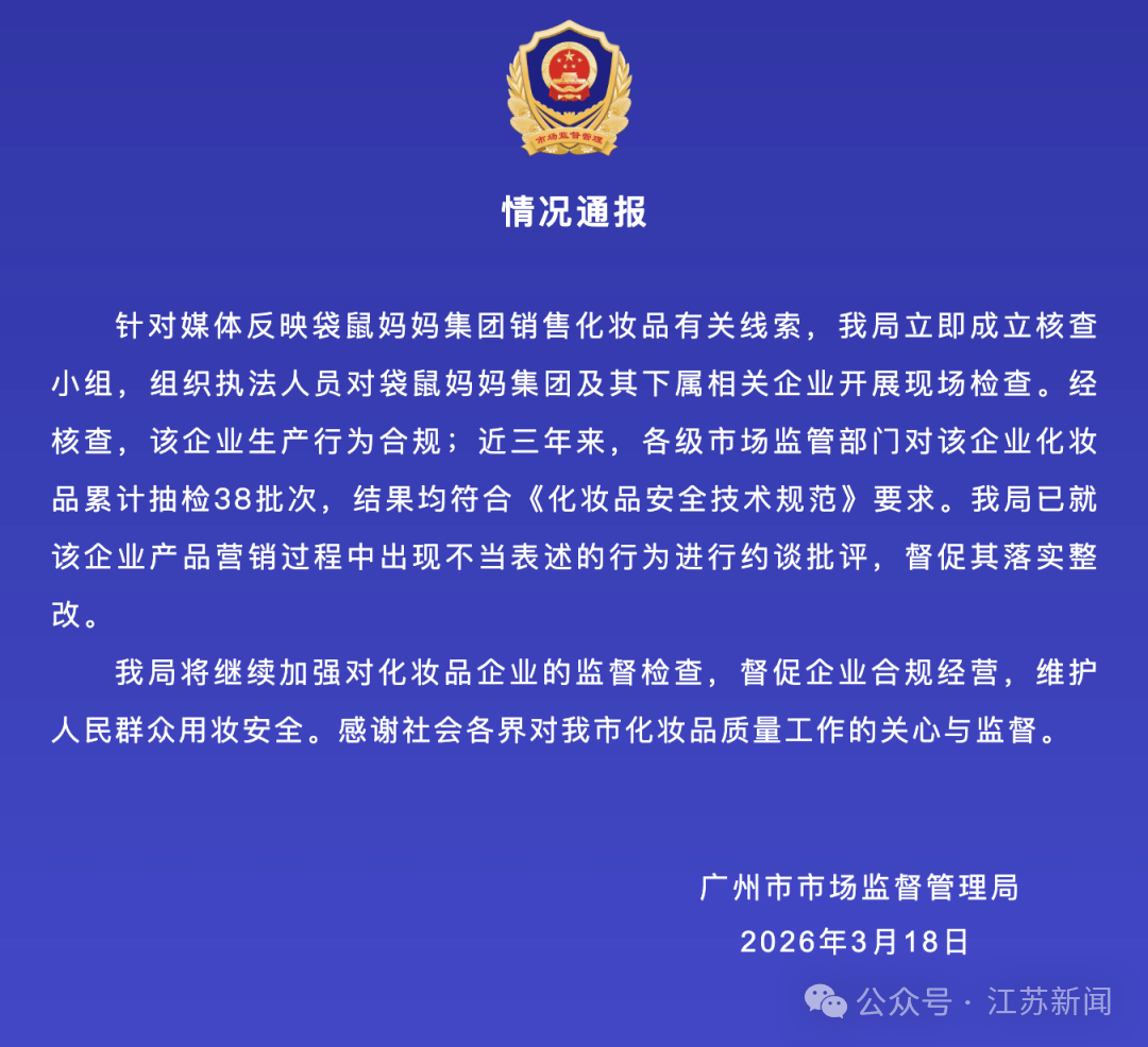 针对媒体反映袋鼠妈妈集团销售化妆品有关线索,我局立即成立核查小组,组织执法人员对袋鼠妈妈集团及其下属相关企业开展现场检查。经核查,该企业生产行为合规;近三年来,各级市场监管部门对该企业化妆品累计抽检38批次,结果均符合《化妆品安全技术规范》要求。我局已就该企业产品营销过程中出现不当表述的行为进行约谈批评,督促其落实整改。