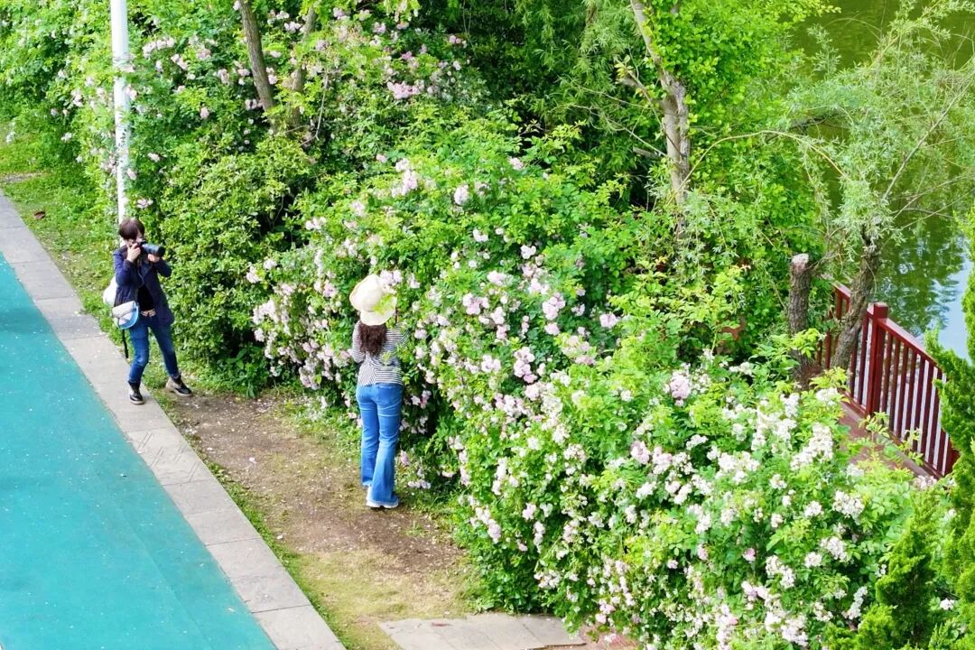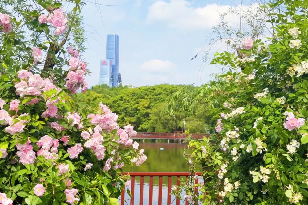 如果说楼宇间的蔷薇是都市中意外的惊喜,那么公园深处的蔷薇,便是自然与生活的完美交融。从观山湖公园慈竹门进入,沿着园区绿道左转,便能邂逅另一番蔷薇盛景——蔷薇花沿着湖畔肆意绽放,暖阳之下,波光粼粼的湖水与柔美动人的蔷薇交相辉映,微风拂过,花香裹挟着湖水的湿润气息沁人心脾,行走其间,令人身心舒畅。