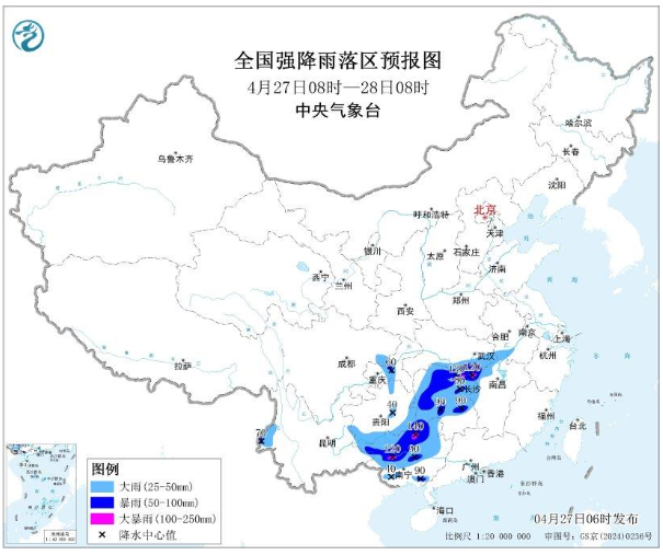 预计,4月27日08时至28日08时,重庆中部、贵州东部和南部、湖南中北部和西部、湖北南部和东部、广西北部、西部和东南部等地部分地区有大到暴雨,其中,湖南北部、江西西北部、广西北部和西部等地局地有大暴雨(100~140毫米)。上述部分地区伴有短时强降水(最大小时降雨量20~50毫米,局地可超过60毫米),局地有雷暴大风或冰雹等强对流天气。