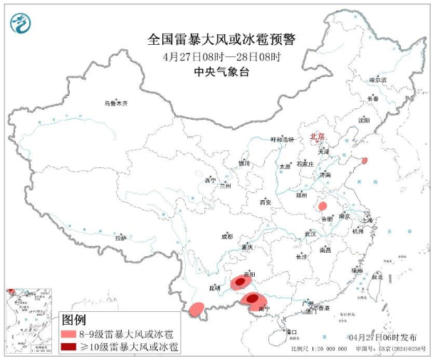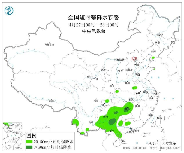 预计4月27日08时至28日08时,黄淮地区东部和西南部、西南地区南部、华南地区西部等地的部分地区将有8级以上雷暴大风或冰雹天气,其中,贵州西南部、广西西部等地的部分地区将有10级以上雷暴大风,最大风力可达11级以上;黄淮地区西南部、西南地区东部和西南部、江南地区西部、华南地区中西部等地的部分地区将有小时雨量大于20毫米的短时强降水天气,其中,湖南东部和西南部、广西北部等地的部分地区小时雨量大于50毫米,最大可达60毫米以上。