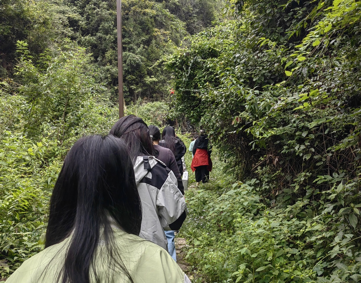 跟随着讲解员,师生们踏上了当年红军突围的崎岖山路,步行至虎井沟红军跳崖处。这段山路相较于过去,已经进行了简单的修缮,然而陡峭的山路依旧让大家步履维艰,大家不禁想到:当年缺衣少食、身负装备的红军,是凭着怎样一股精神杀出重围的?