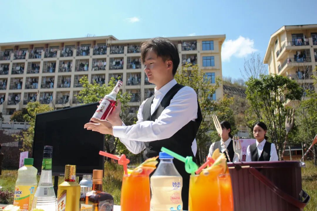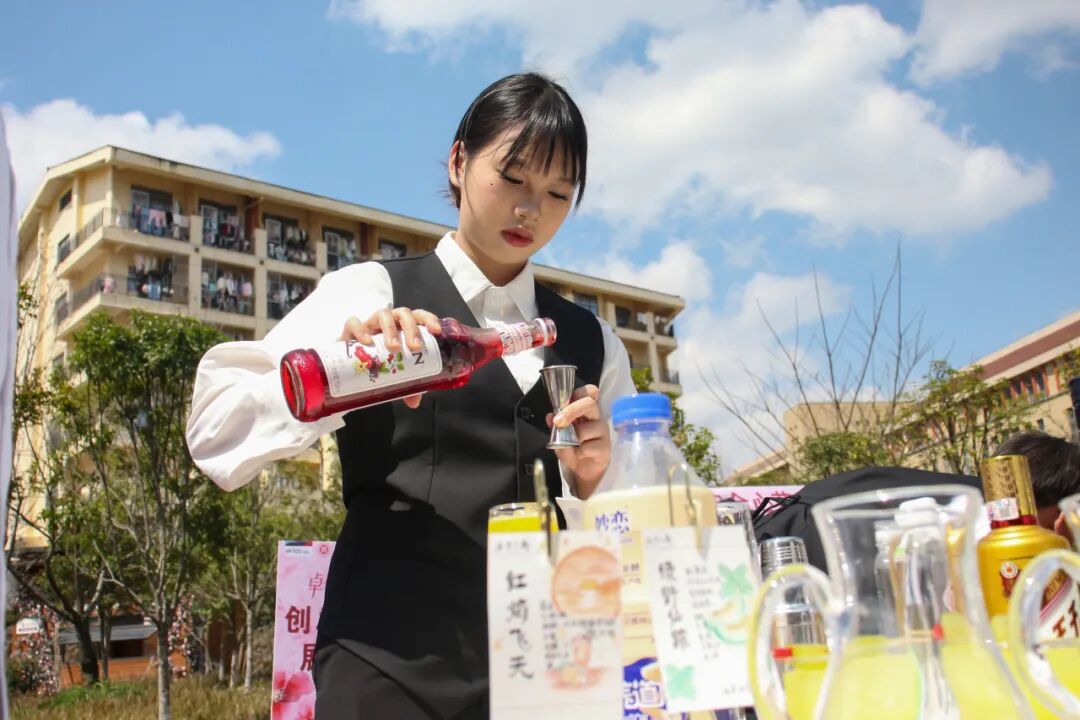 “创‘调’未来”环节将活动推向高潮,技能大赛参赛学生同台竞技,工商管理系学生现场调制原创调饮,企业专家现场点评指导,充分展现学院“技能服务区域产业”的职教理念。