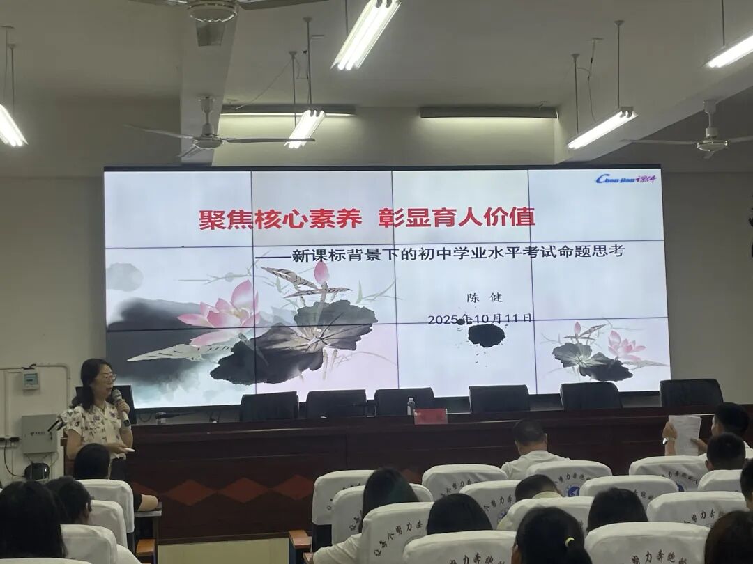 本次活动还邀请了贵阳市教育科学研究所陈健老师开展题为《聚焦核心素养,彰显育人价值——新课标背景下的初中学业水平考试命题思考》的专题讲座。陈老师围绕“教学评一体化”“彰显育人理念”两个方面进行分享,强调命题设计要注重学科逻辑、知识创新与学生发展,从中考定位、命题现状、改革趋势、典型案例等方面入手来探索“命题”这一长期、持久的学科大课题,在命题设计中贯彻落实“立德树人”根本任务。