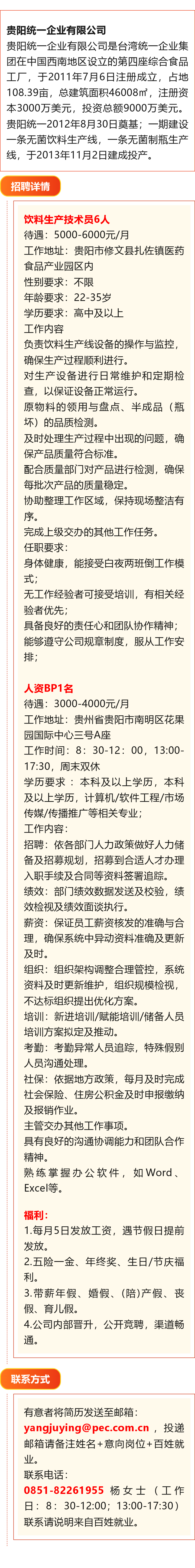 【知名企业】贵阳统一招聘饮料生产技术员等岗位!五险一金!年终奖!
