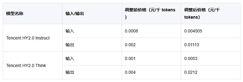 混元系列模型Tencent HY2.0 Instruct与Tencent HY2.0 Think的价格上调。Tencent HY2.0Instruct输入价格从每千tokens0.0008元调整为0.004505元,涨幅高达463%;输出价格也从0.002元拉升至0.01113元,涨幅超过456% 。Tencent HY2.0Think输入价格从0.001元调整为0.0053元,输出价格从0.004元调整为0.0212元。套餐订阅用户可通过套餐抵扣部分费用。