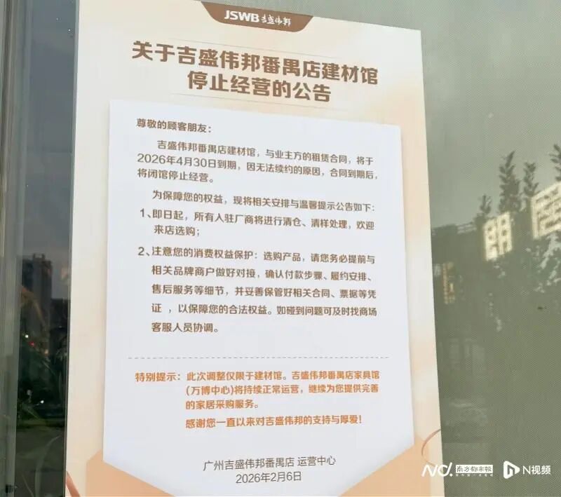 网传照片显示,吉盛伟邦番禺店建材馆与业主方的租赁合同将于2026年4月30日到期,因无法续约的原因,合同到期后将闭馆停止运营。其中还提到,即日起所有入驻厂商将进行清仓、清样处理。此次调整仅限于建材馆,广州吉盛伟邦番禺店家居馆将持续运营。