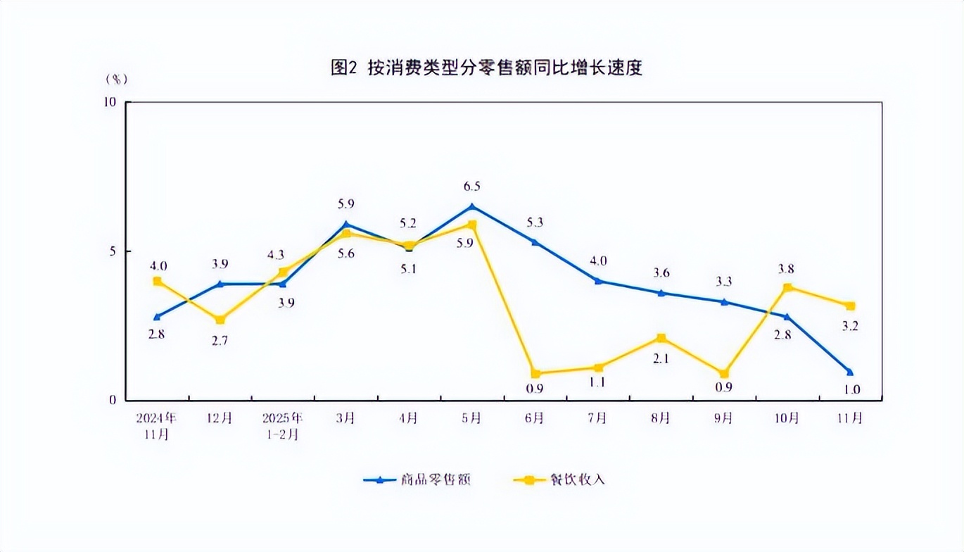 按消费类型分,11月份,商品零售额37841亿元,同比增长1.0%;餐饮收入6057亿元,增长3.2%。1—11月份,商品零售额403822亿元,增长4.1%;餐饮收入52245亿元,增长3.3%。