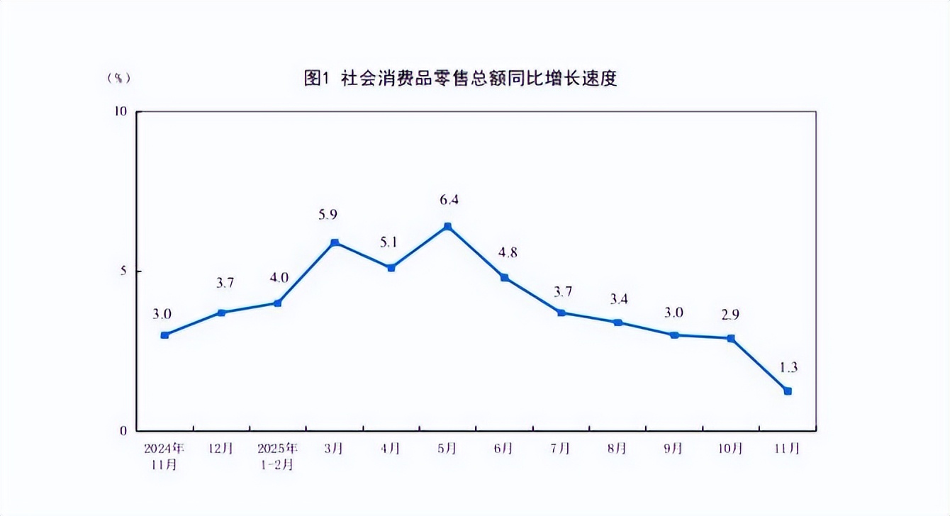 国家统计局:11月份社会消费品零售总额增长1.3%