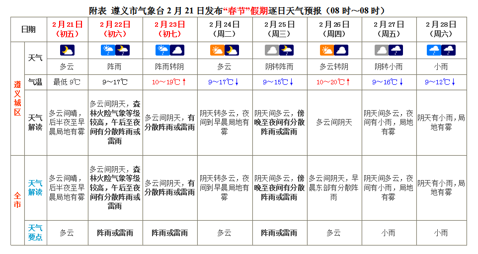 根据遵义气象预报,新一股冷空气即将到达,在冷空气到来后,雨水将再次返场,大部地区气温会有所下降,局地有雾。返程期间,遇雨雾天气,请谨慎驾驶。