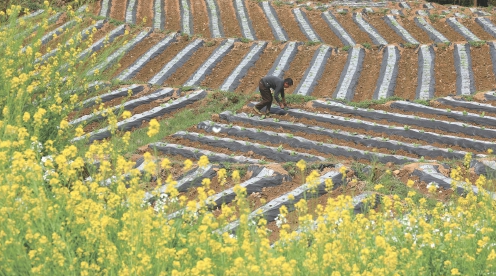 3月20日,云南省腾冲市北海镇花园村农民在田间管护农作物。正值春耕关键时节,当地农民开展覆膜保墒、施肥除草等田间管护作业,为全年丰产丰收打下坚实基础。龚祖金 摄 新华社发