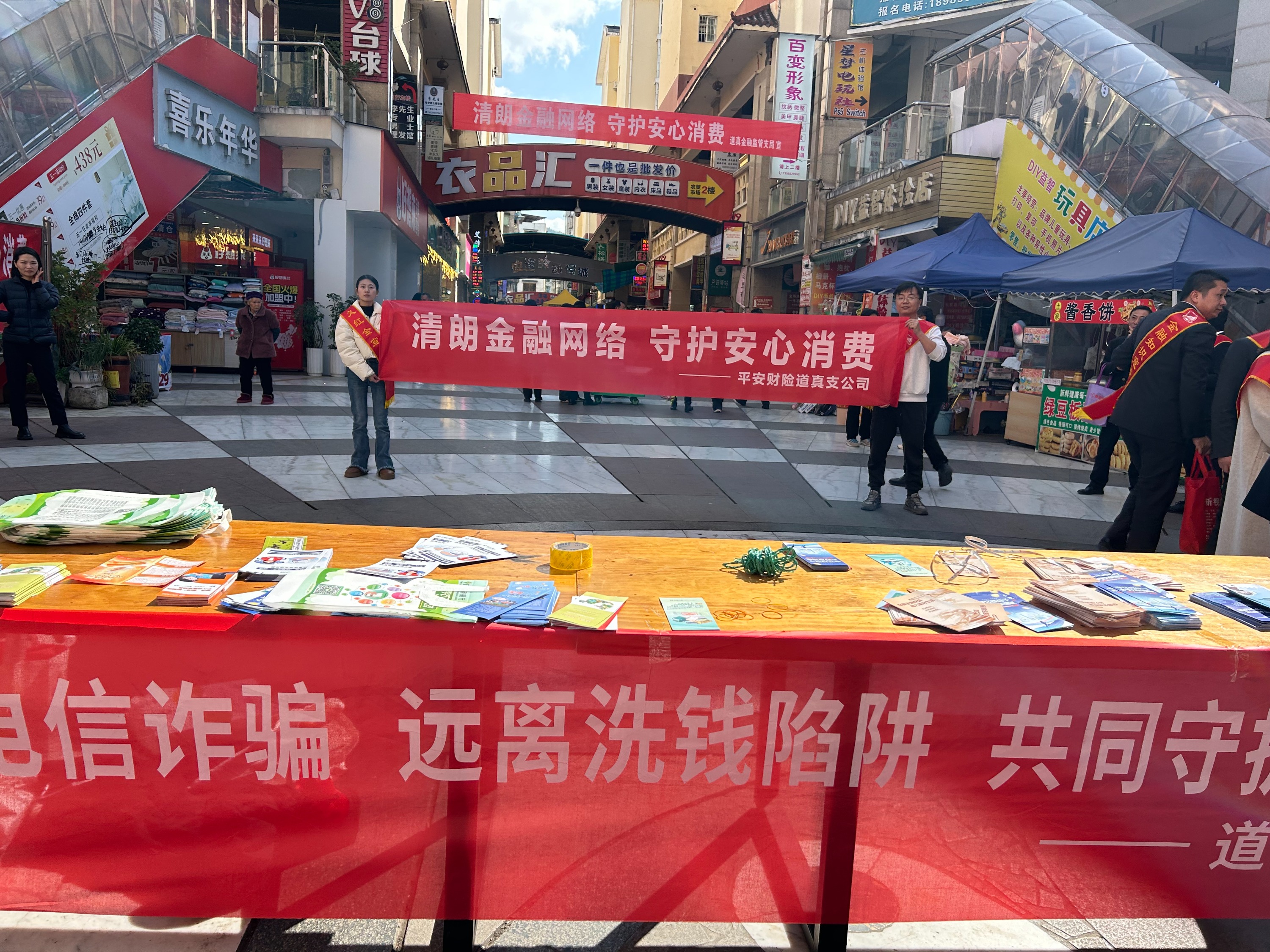 在国家金融监督管理总局道真监管支局统筹部署下,平安产险道真支公司紧扣“清朗金融网络 守护安心消费”主题,于3月10日走进林达步行街核心商圈,以“场景化科普+互动化体验”模式,开展沉浸式金融消保宣传服务,将风险防范知识送到群众身边。