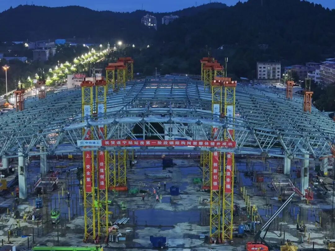 记者从国铁成都局获悉,9月19日,随着800吨屋盖网架钢结构一次吊装完成,标志着由中铁建工集团有限公司承建的新建成都至达州至万州铁路遂宁站北站房主体工程顺利完工,遂宁站站房工程进入装饰装修施工阶段。