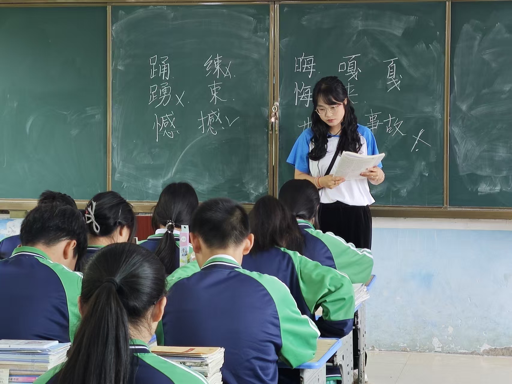 这不是在直播间,而是在贵州省金沙县源村镇初级中学八(2)班的语文课上。讲台上的女生是来这里支教的贵州师范大学研究生支教团成员韦方尖。