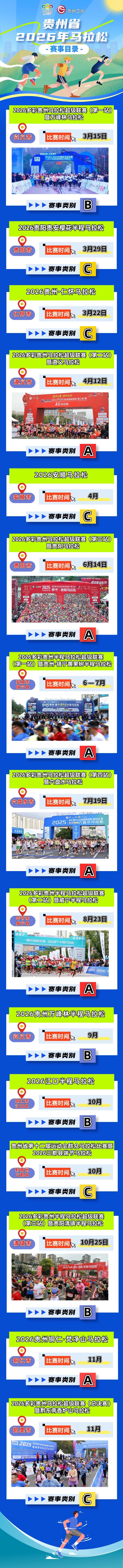 为响应广大跑友需求,在2025年赛事经验基础上,2026年多彩贵州马拉松超级联赛增加了3场赛事。