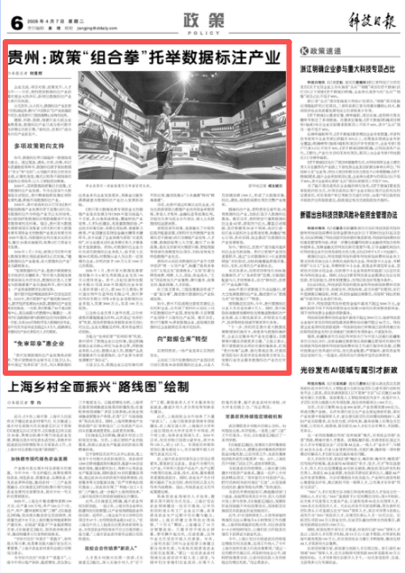 今天(4月7日),《科技日报》刊发了题为《贵州:政策“组合拳”托举数据标注产业》的报道。