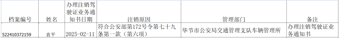 根据《机动车驾驶证申领和使用规定》(中华人民共和国公安部令第172号)第七十九条第一款第(六)项之规定,以下驾驶人的机动车驾驶证应依法办理注销业务,现予以公告告知,敦促相关人员于30日内到辖区公安交通管理部门车辆管理所办理驾驶证注销业务,交回原机动车驾驶证,逾期未到车管所办理的,车管所将依法注销驾驶证。