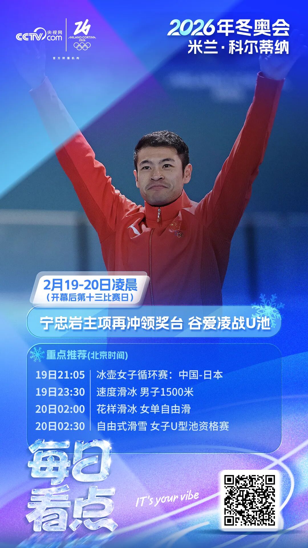 北京时间2月19日至2月20日凌晨,米兰-科尔蒂纳冬奥会迎来开幕后的第13个比赛日,共产生6枚金牌。中国选手宁忠岩将向速滑男子1500米金牌发起冲击,谷爱凌领衔出战自由式滑雪U型池预赛。
