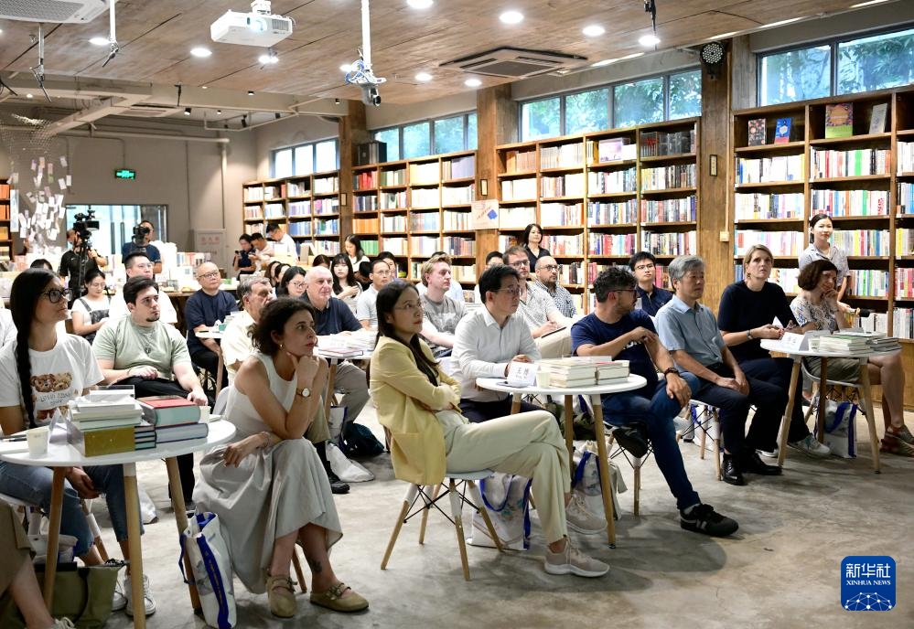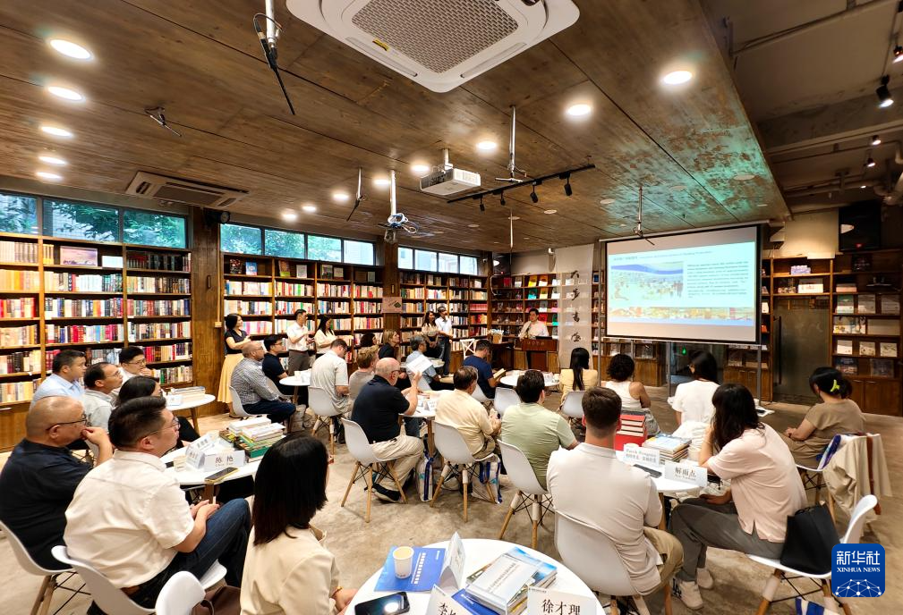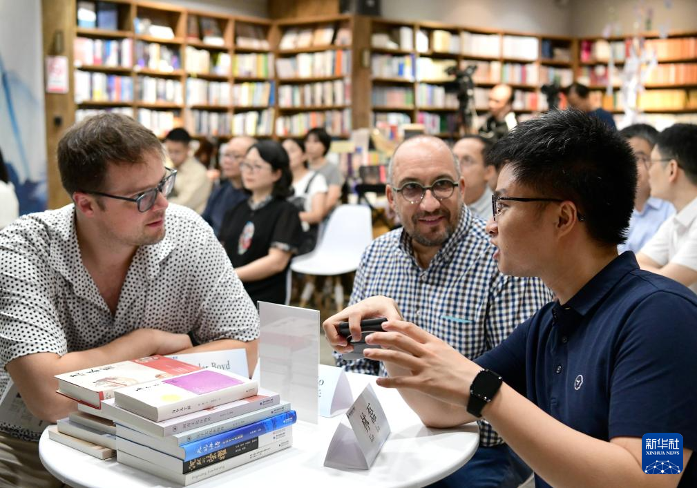 美国《中国书评》副主编李乐(前左)和西班牙瓦伦西亚大学东亚研究所教授加布里埃尔·罗乔(前中)同工作人员交流。新华社记者 魏培全 摄