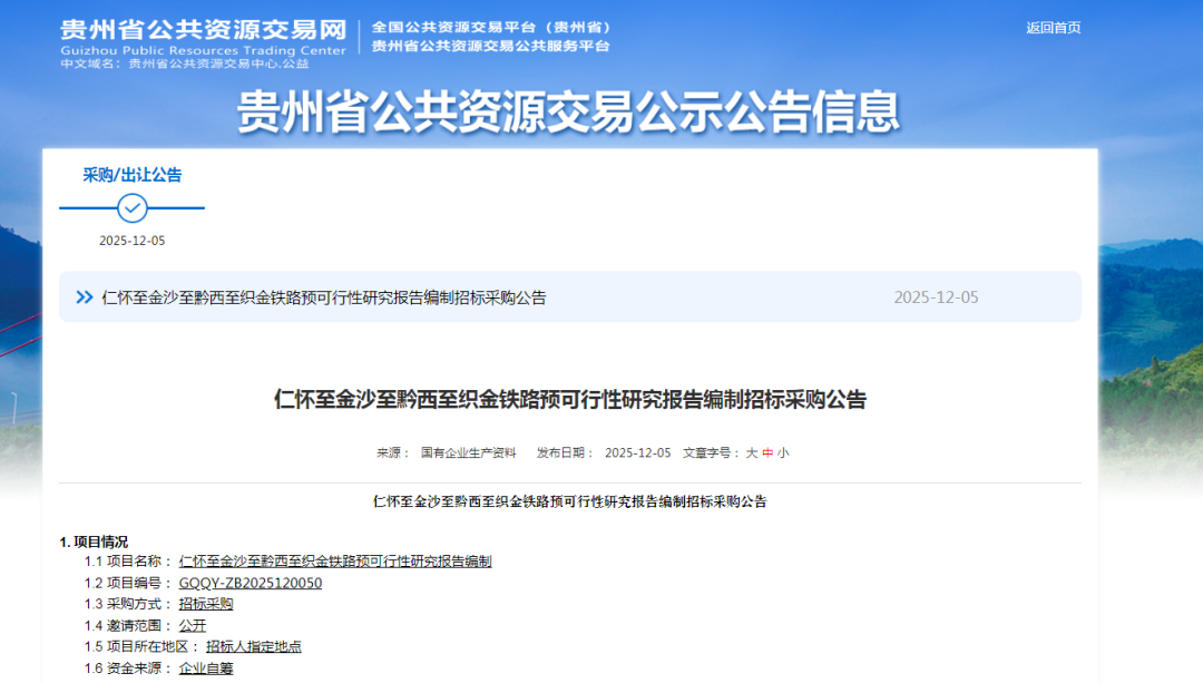 近日,贵州省公共资源交易网发布仁怀至金沙至黔西至织金铁路预可行性研究报告编制招标采购公告。