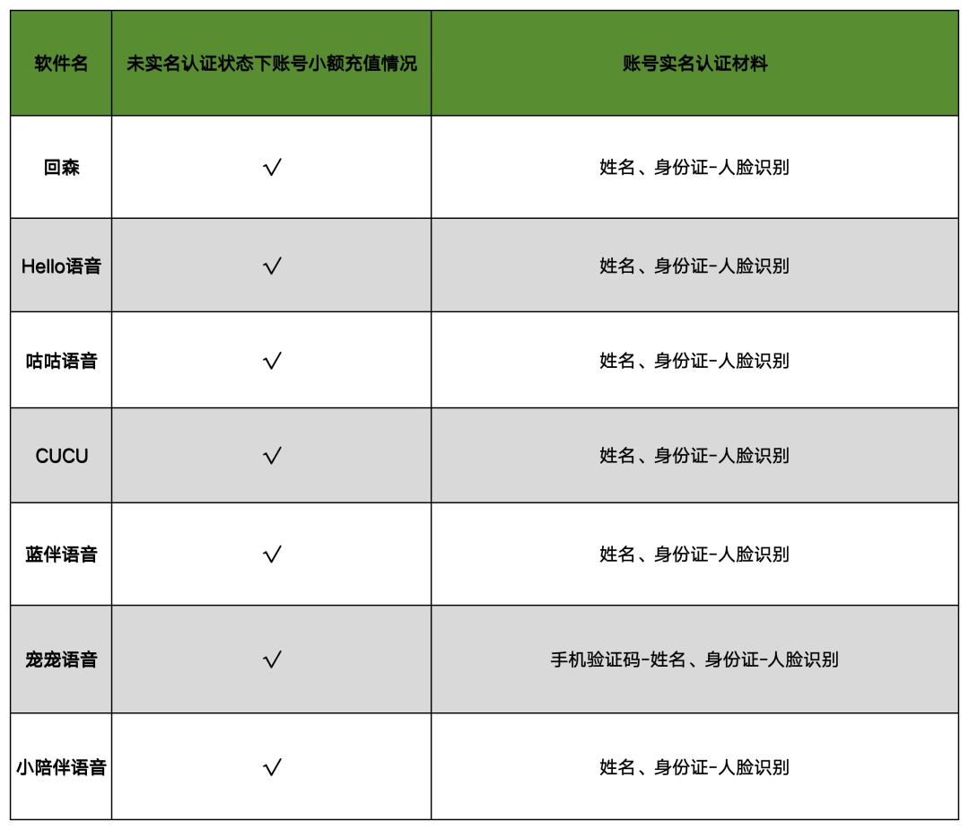 ▲记者在账号未实名认证状态下对7款语音社交软件进行小额充值测试,均能实现充值。 新京报贝壳财经记者韦英姿 制图