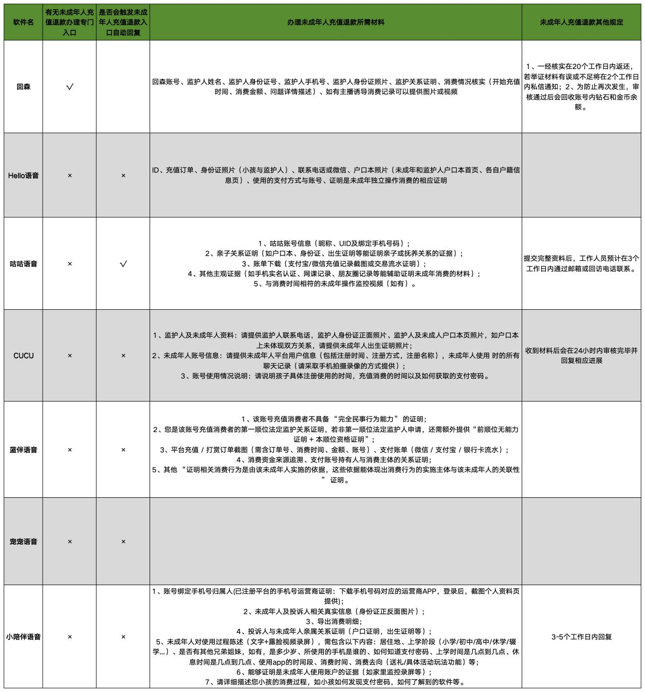 记者还借家长名义试图在上述语音软件进行未成年人退款,发现在前述7款语音社交软件中,仅回森在软件内设置了专门的未成年人打赏退款处理渠道,其余软件均从客服通道解决。