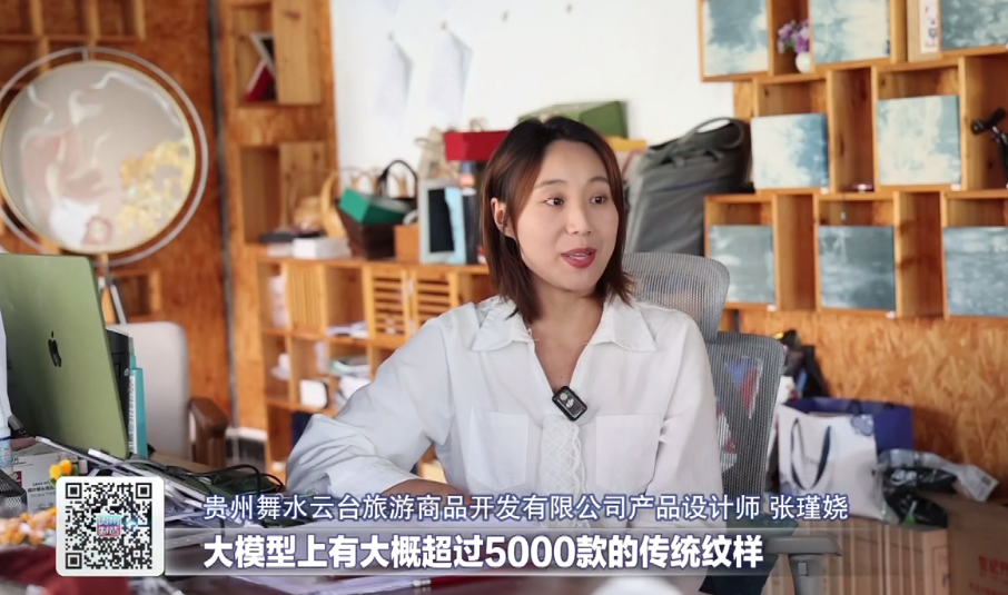 贵州舞水云台旅游商品开发有限公司产品设计师张瑾娆说,大模型上有大概超过5000款的传统纹样, 现在和手机壳、奶粉企业进行合作。AI大模型辅助设计,大概一分钟可以生成几十张图片。