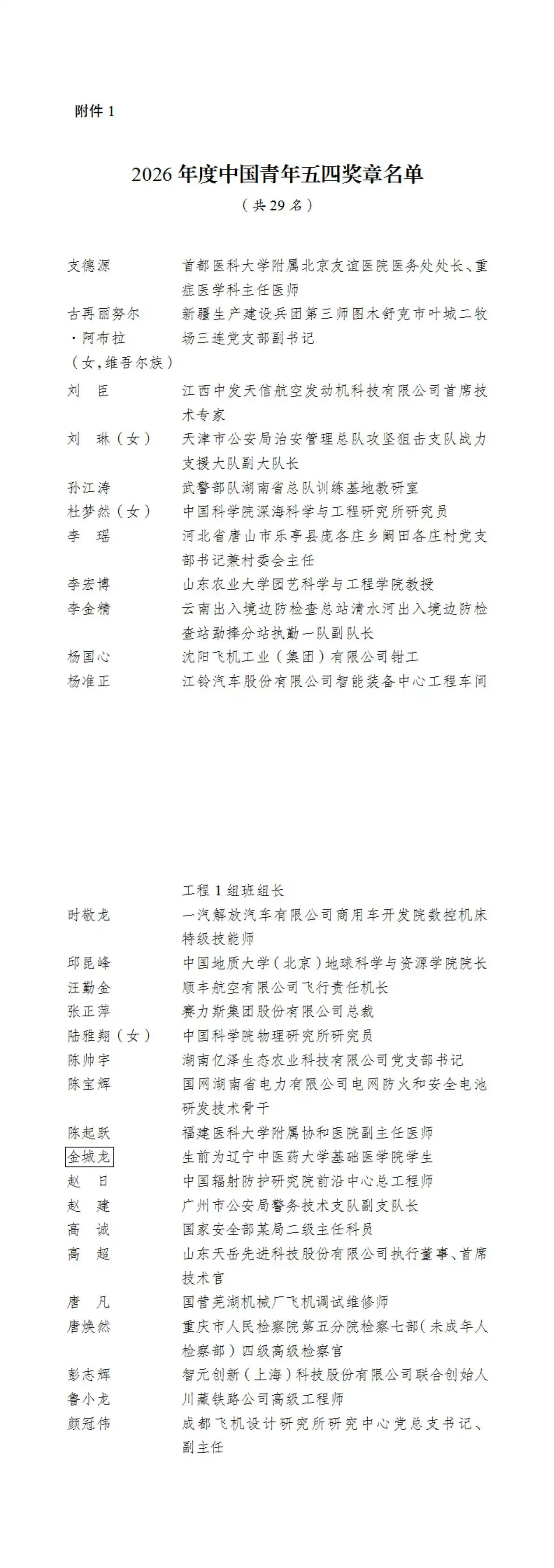 荣获2026年度中国青年五四奖章的分别是:首都医科大学附属北京友谊医院医务处处长、重症医学科主任医师支德源,新疆生产建设兵团第三师图木舒克市叶城二牧场三连党支部副书记古再丽努尔·阿布拉(女),江西中发天信航空发动机科技有限公司首席技术专家刘臣,天津市公安局治安管理总队攻坚狙击支队战力支援大队副大队长刘琳(女),武警部队湖南省总队训练基地教研室孙江涛,中国科学院深海科学与工程研究所研究员杜梦然(女),河北省唐山市乐亭县庞各庄乡阚田各庄村党支部书记兼村委会主任李瑶,山东农业大学园艺科学与工程学院教授李宏博,云南出入境边防检查总站清水河出入境边防检查站勐捧分站执勤一队副队长李金精,沈阳飞机工业(集团)有限公司钳工杨国心,江铃汽车股份有限公司智能装备中心工程车间工程1组班组长杨准正,一汽解放汽车有限公司商用车开发院数控机床特级技能师时敬龙,中国地质大学(北京)地球科学与资源学院院长邱昆峰,顺丰航空有限公司飞行责任机长汪勤金,赛力斯集团股份有限公司总裁张正萍,中国科学院物理研究所研究员陆雅翔(女),湖南亿泽生态农业科技有限公司党支部书记陈帅宇,国网湖南省电力有限公司电网防火和安全电池研发技术骨干陈宝辉,福建医科大学附属协和医院副主任医师陈起跃,辽宁中医药大学基础医学院学生金城龙,中国辐射防护研究院前沿中心总工程师赵日,广州市公安局警务技术支队副支队长赵建,国家安全部某局二级主任科员高诚,山东天岳先进科技股份有限公司执行董事、首席技术官高超,国营芜湖机械厂飞机调试维修师唐凡,重庆市人民检察院第五分院检察七部(未成年人检察部)四级高级检察官唐焕然,智元创新(上海)科技股份有限公司联合创始人彭志辉,川藏铁路公司高级工程师鲁小龙,成都飞机设计研究所研究中心党总支书记、副主任颜冠伟。