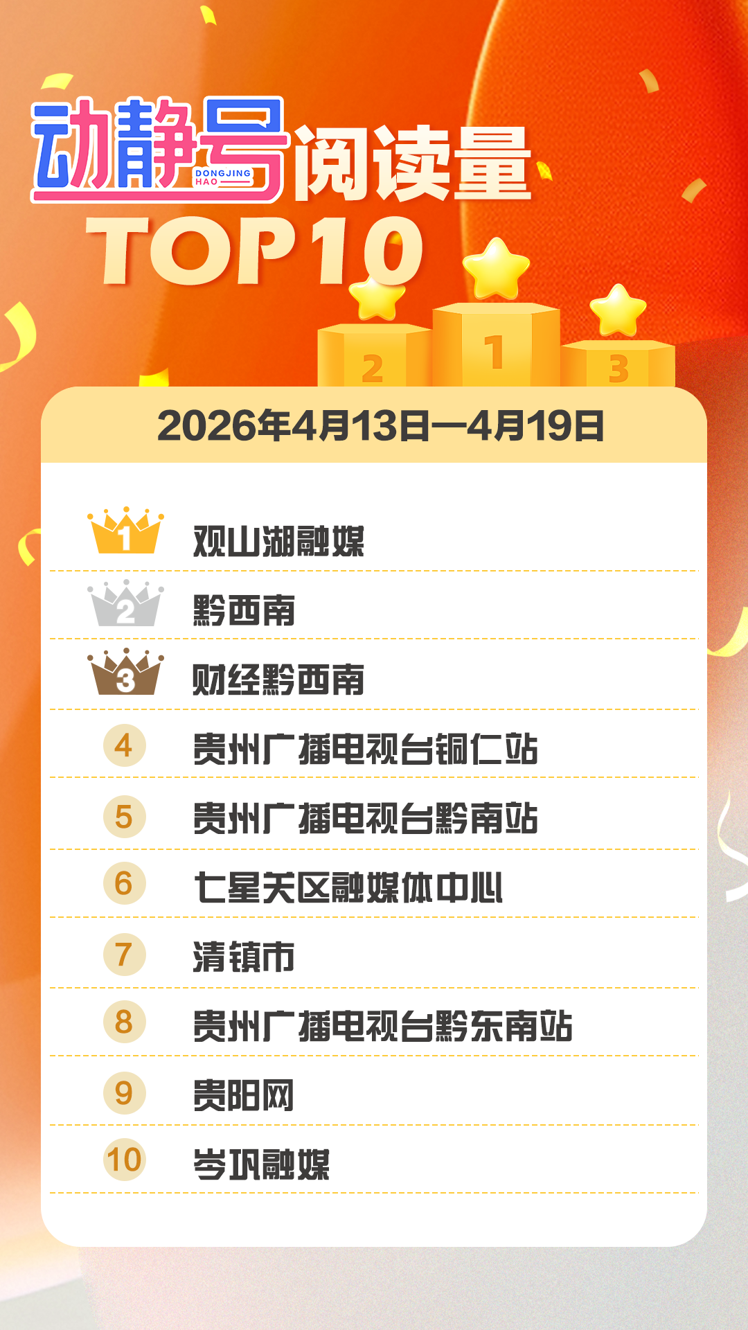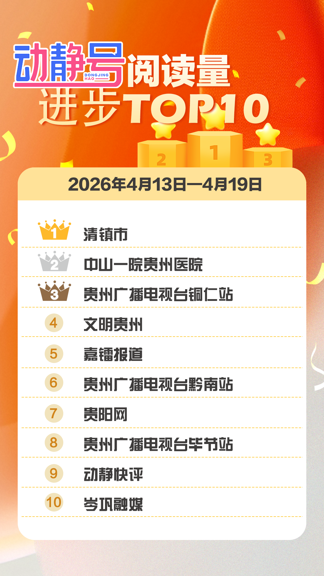阅读量方面,清镇市、中山一院贵州医院、贵州广播电视台铜仁站领跑,单周阅读增量均突破25万,热度攀升显著;第四名至第十名单周阅读增量均突破10万整体表现亮眼。