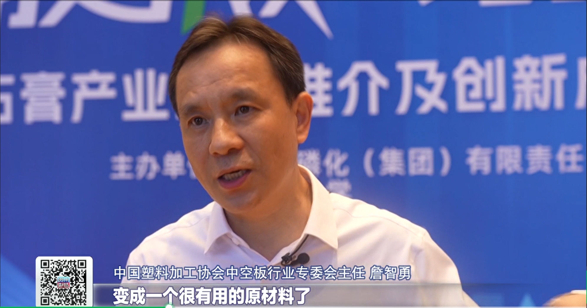 中国塑料加工协会中空板行业专委会主任詹智勇介绍,原来这是个工业固废,但是通过新的技术把它直接资源化了,变成一个很有用的原材料。