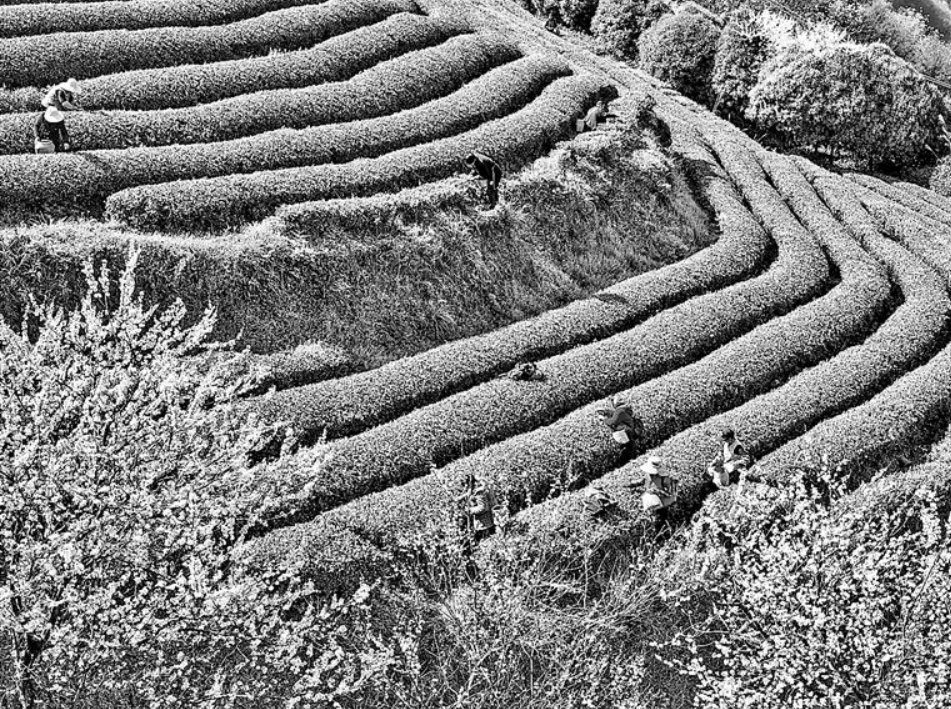 近日,贵州省开阳县南龙乡田坎村的茶树悄然萌发嫩绿的新芽,采茶人穿行于翠绿的茶山,采摘春茶。