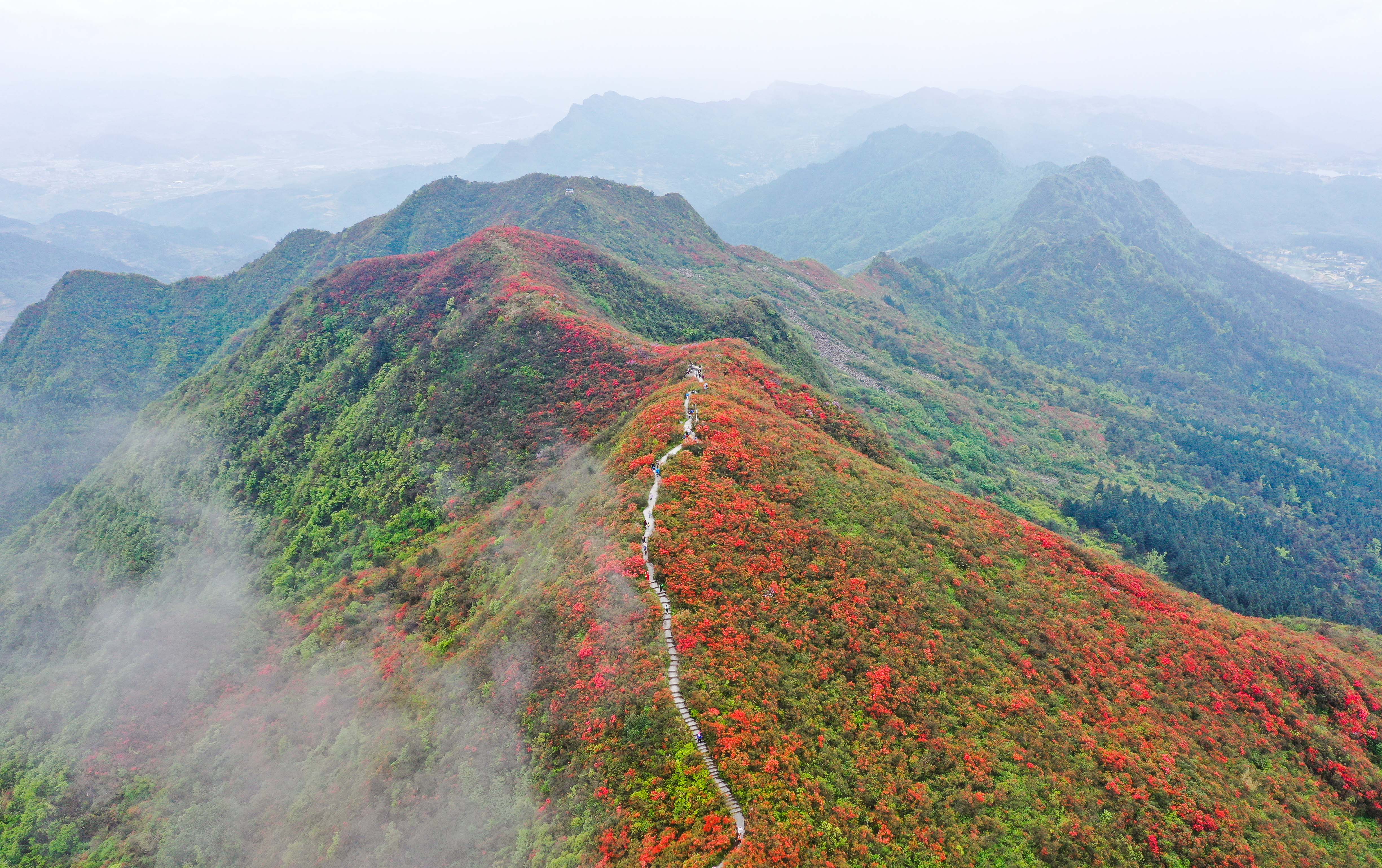 龙泉山九百九十九级“步步登高”石径台阶,承载着古人的处世哲学,也串联起一路的繁花盛景。登顶远眺,漫山杜鹃尽收眼底,丹寨县城的全貌在山下铺展,山水相依,花海为伴,每一步都踏在春日的诗行里。
