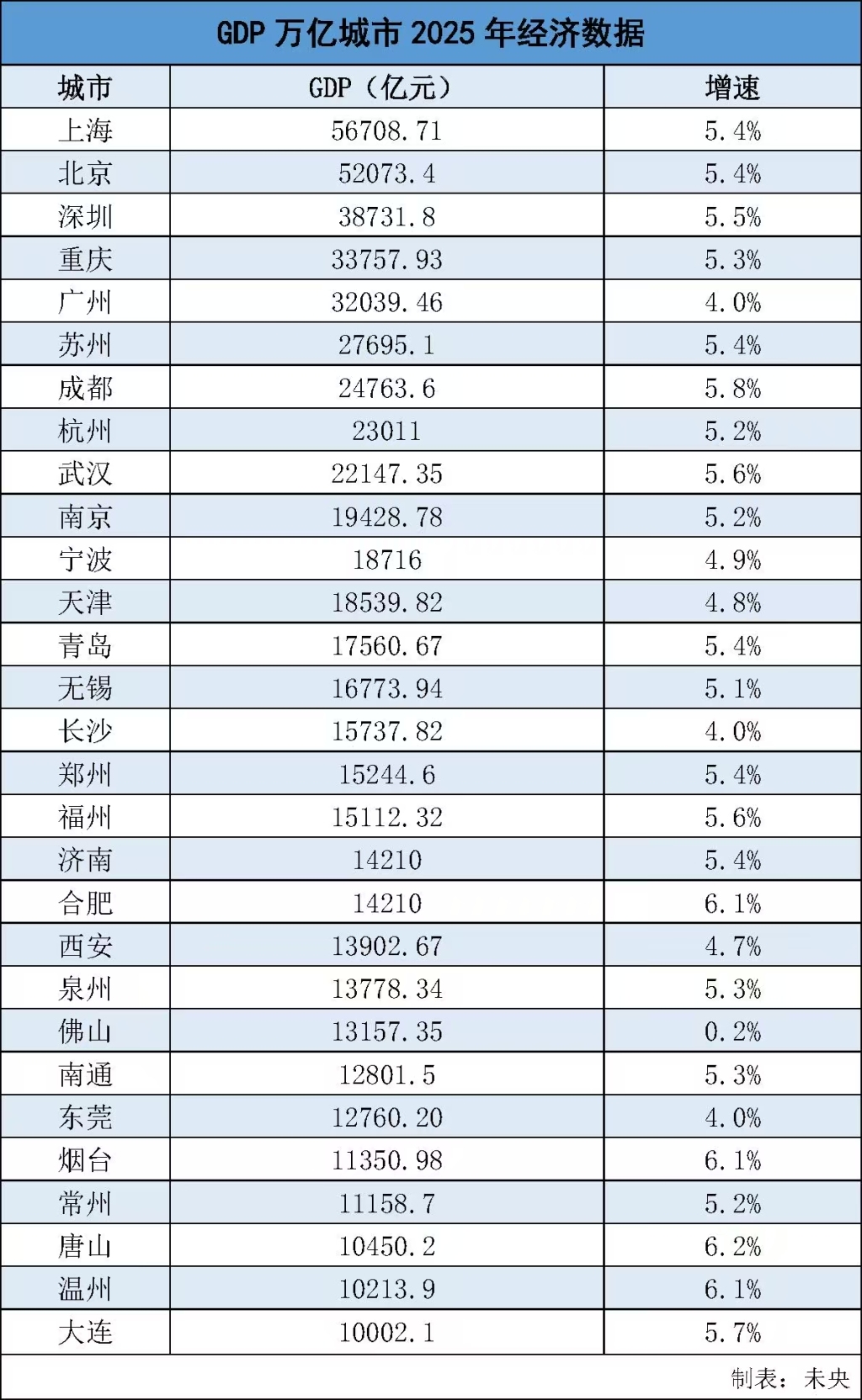 上海地区生产总值列全球城市第五位,2025年达到5.67万亿,北京为5.21万亿——对它们而言,“万亿”只是一个季度的产出价值;深、渝、穗三市的体量在3万亿以上;上述5市加上苏州、成都、杭州、武汉、南京,形成目前的“全国城市十强”,门槛逼近2万亿(南京1.94万亿)。