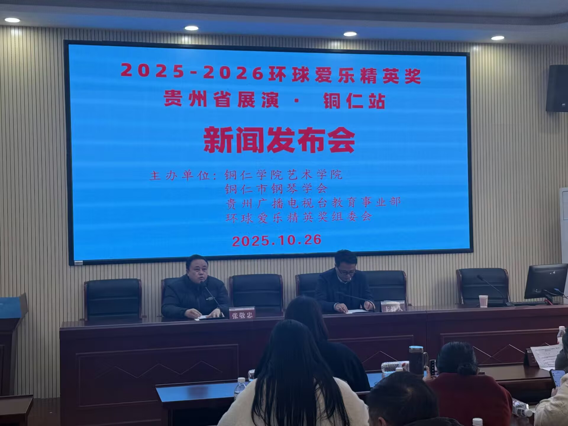 2025年10月26日,由铜仁学院艺术学院、铜仁市钢琴学会、贵州广播电视台教育事业部、环球爱乐精英奖组委会主办的“2025-2026环球爱乐精英奖·贵州省展演·铜仁站”新闻发布会在铜仁学院艺术学院成功举行。来自铜仁市各县、区艺术培训学校负责人、艺术教育指导教师参加会议,铜仁学院艺术学院党委副书记、院长张敬忠教授,艺术学院党委副书记麻晔斐副教授,艺术学院音乐学专业负责人王明远教授出席会议,发布会由贵州广播电视台一级导演,教育事业部副主任王俐主持。