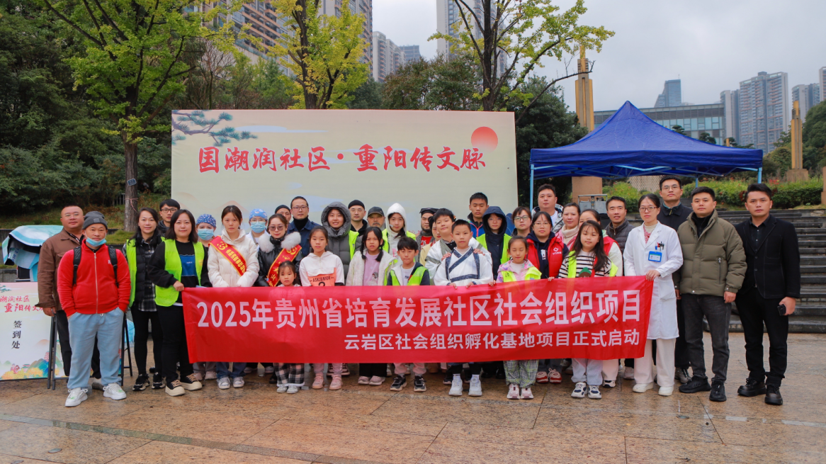岁岁重阳,今又重阳。2025年10月20日-10月25日,为传承中华优秀传统文化,丰富社区居民精神文化生活,尤其关怀老年群体,贵州省民政厅社会组织孵化基地(云岩区)携手孵化基地二十几家社会组织,阳明云社区、足研社社区服务队、大成拳社区服务队、观山堂新水墨研究中心、九典书房国学文化服务队、清元兴学古琴文化服务队、花之莲口腔、七月消防、时光糖艺术文化服务队,由贵阳市众心阳社区文化公益活动促进中心牵头,联合知行社区、斯美社区、兹美社区、思明社区、思齐社区、三省社区,澜亭社区、澜湾社区、贵阳市云岩区水东社区第一卫生服务站等多加社区,爱心企业四川天府银行贵阳未来方舟支行、贵州百农农业有限公司、贵州好善来健康产业有限公司、贵阳东方骨科医院、中国平安保险贵州公司、通用医疗三OO医院中医康复科,共同开展“国潮润社区·重阳传文脉”社区传统文化周活动,以多元形式让传统文化在社区落地生根,让居民感受节日温情与文化魅力。