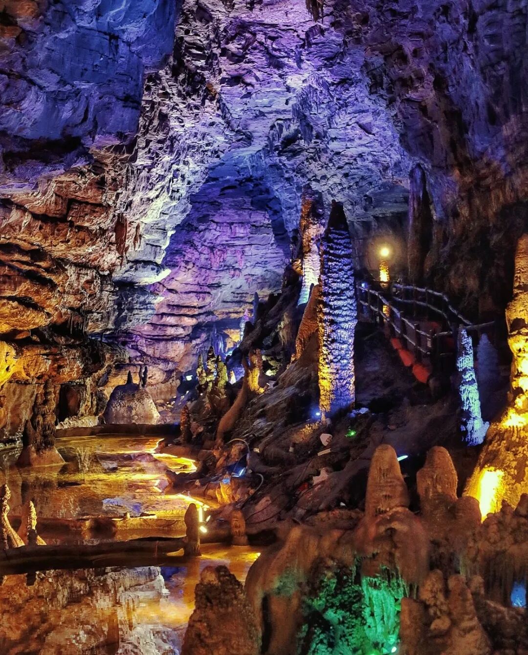 一靠近洞口就能感觉周围温度下降,就像走进了一个天然大冰箱。洞内遍布有各种形状的石笋、石柱、石芽,洞道纵横曲折,钟乳石星罗棋布,洞雾水雾飘渺,行在其中既觉有趣又觉神秘。