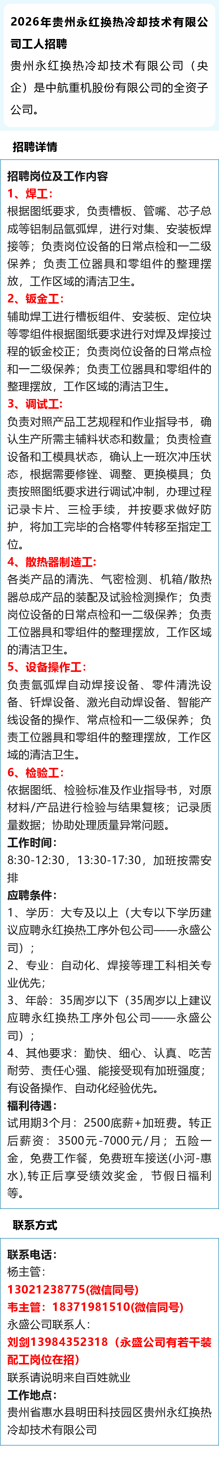 【央企】贵州永红换热冷却技术有限公司招聘!五险一金!免费工作餐!