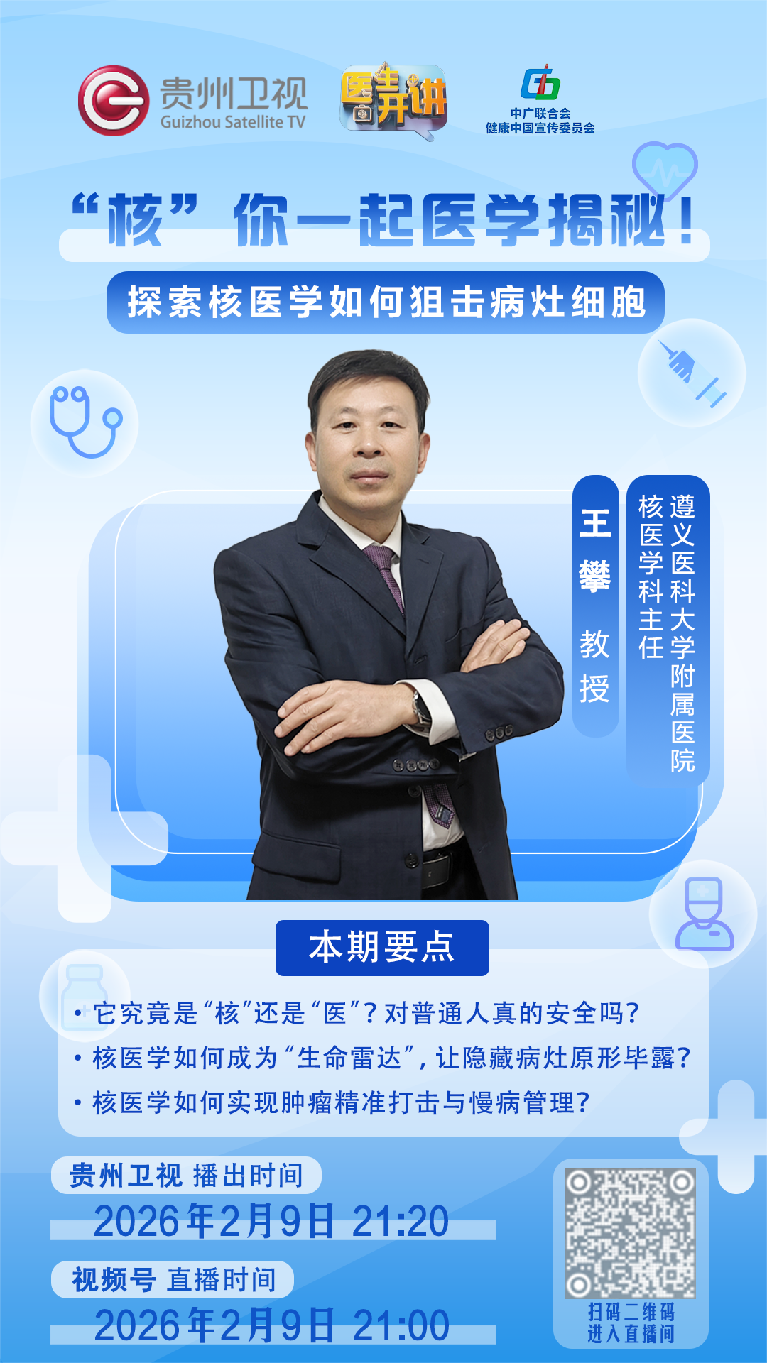 锁定2月9日21:20贵州卫视《医生开讲》,跟随王教授一起,科学认识,消除恐惧,拥抱现代医学带来的生命希望!精彩不容错过,别忘了准时收看!