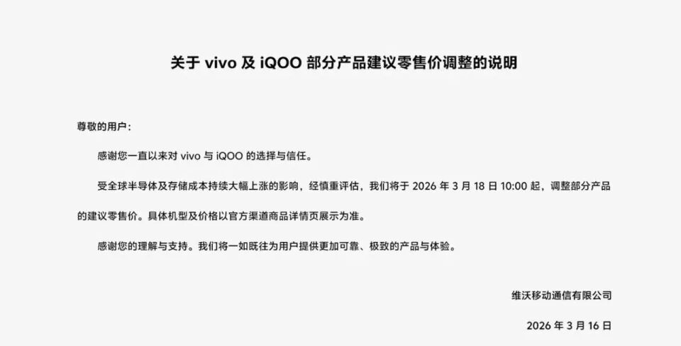 3月16日,vivo发布《关于vivo及iQOO部分产品建议零售价调整的说明》称,受全球半导体及存储成本持续大幅上涨的影响,经慎重评估,vivo将于2026年3月18日10:00起,调整部分产品的建议零售价,具体机型及价格以官方渠道商品详情页展示为准。