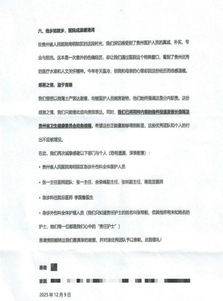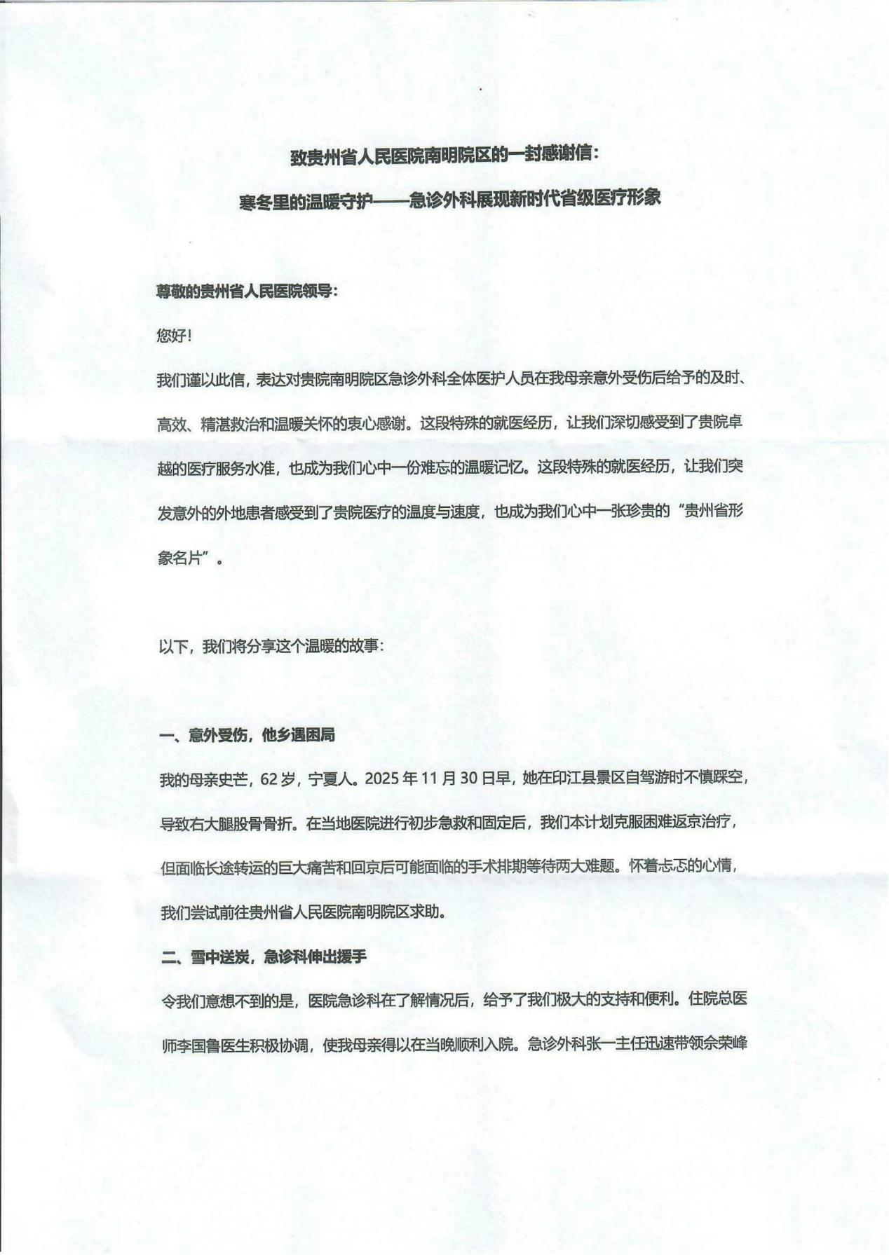 来信中,患者家属特别向贵州省人民医院南明院区急诊外伤科全体医护人员、张一医生、急诊科住院总医师李国鲁以及急诊外伤科护理团队表达了诚挚感谢,并希望能对这一优秀集体给予肯定和表彰。