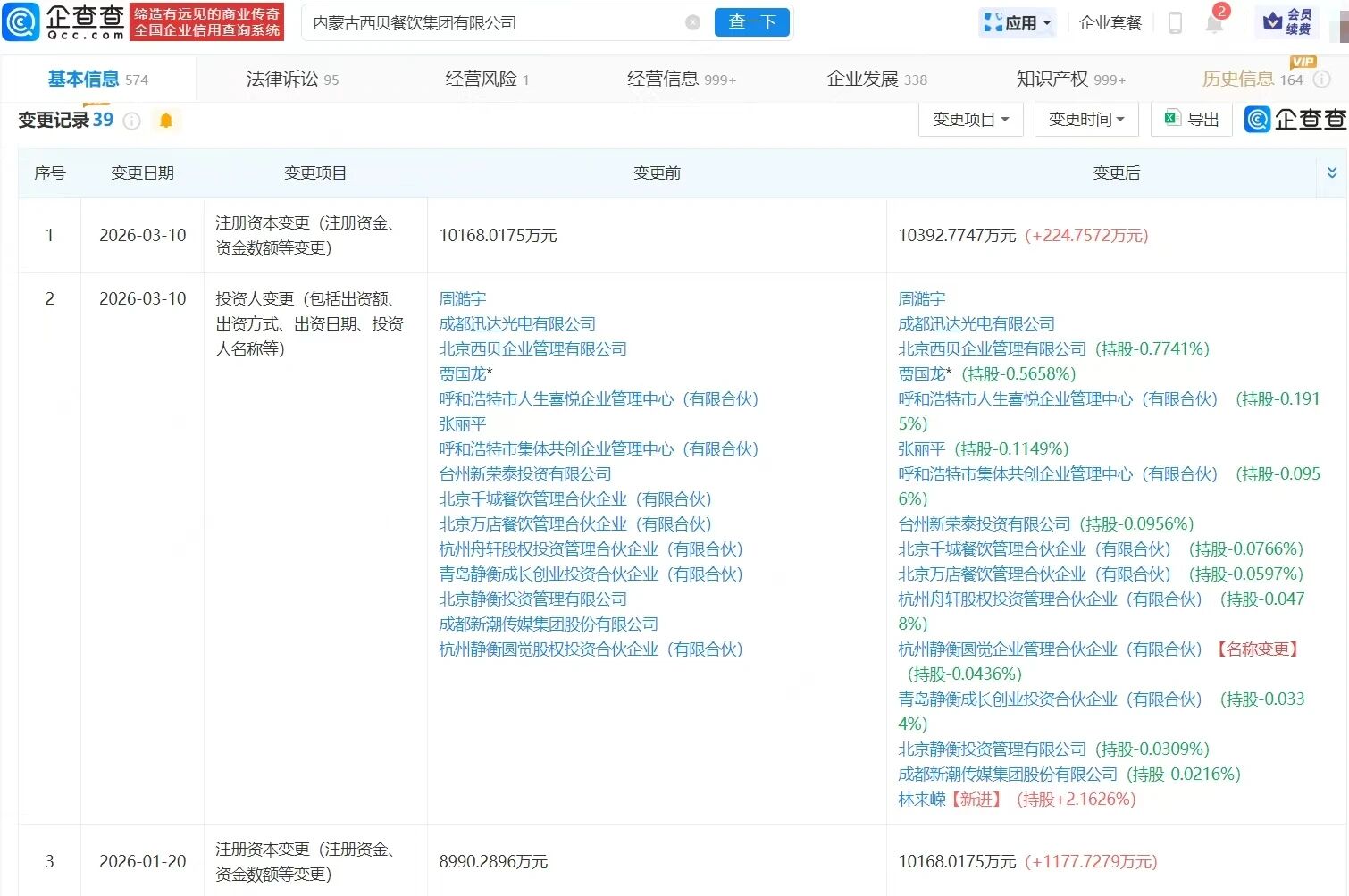 企查查APP显示,近日,内蒙古西贝餐饮集团有限公司发生工商变更,新增林来嵘为股东,注册资本由约1.02亿元增至1.04亿元,今年1月20日,该公司注册资本由8990万元增至约1.02亿元。
