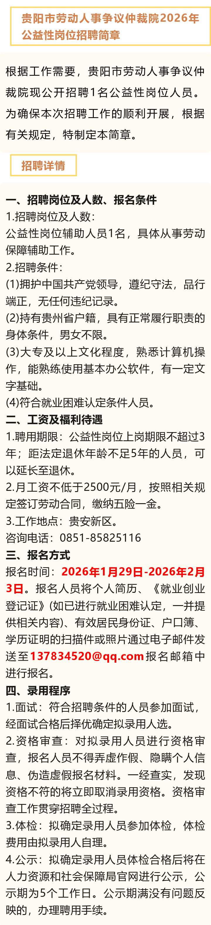 贵阳市劳动人事争议仲裁院招聘!报名截止时间:2026年2月3日!