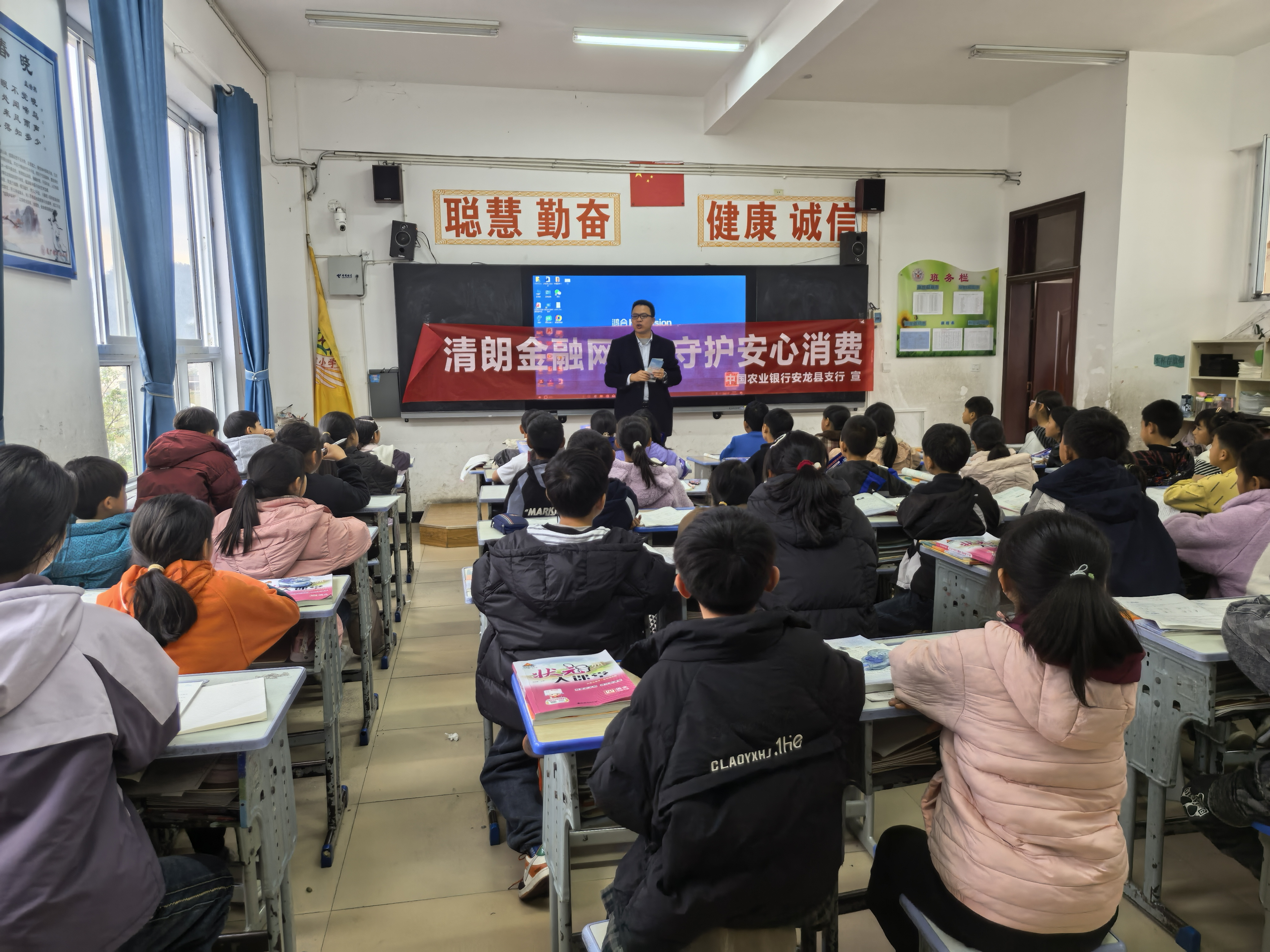在龙广镇中心小学,通过图文讲解和互动问答,向小学生普及人民币防伪、信息保护和防诈骗知识,帮助学生树立正确消费观,提升风险防范意识,营造安全校园金融环境。
