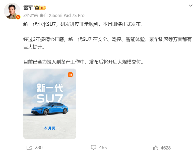 雷军称,新一代小米SU7,研发进度非常顺利,本月即将正式发布。目前已全力投入到备产工作中,发布后将开启大规模交付。