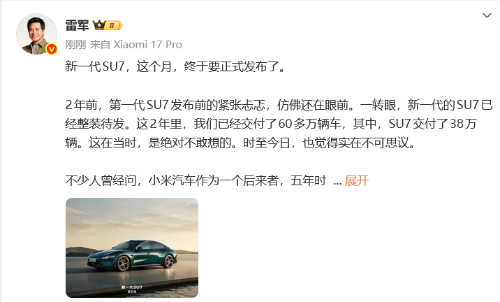 3月13日,雷军发长文谈新一代SU7: