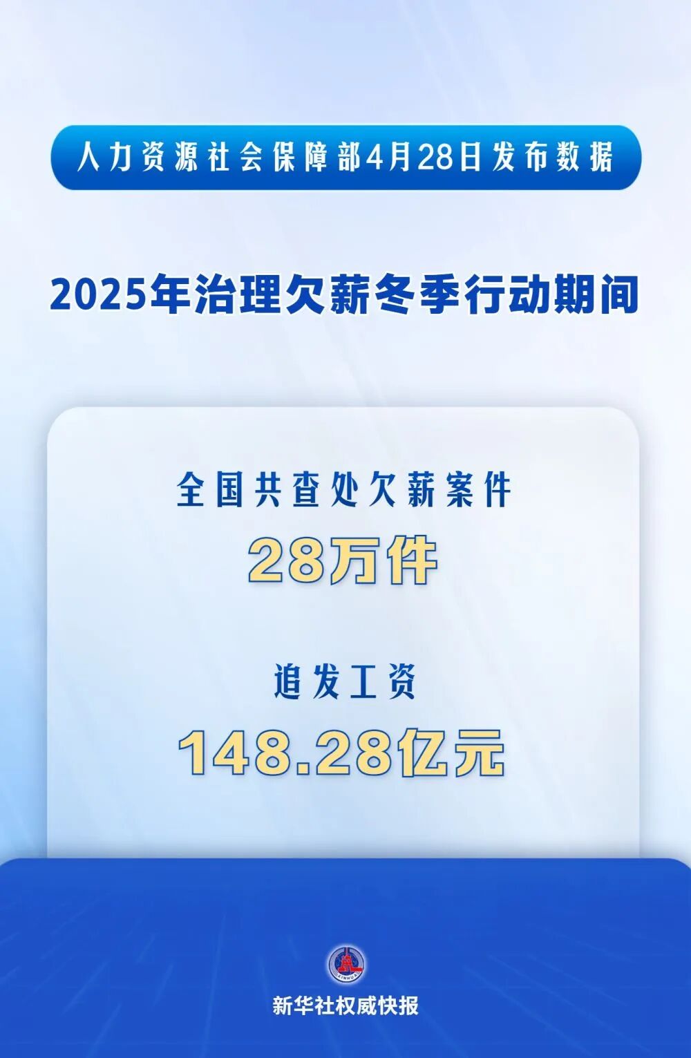 据新华社,人力资源社会保障部4月28日发布数据显示,2025年治理欠薪冬季行动期间,全国共查处欠薪案件28万件,为147.78万名劳动者追发工资148.28亿元。
