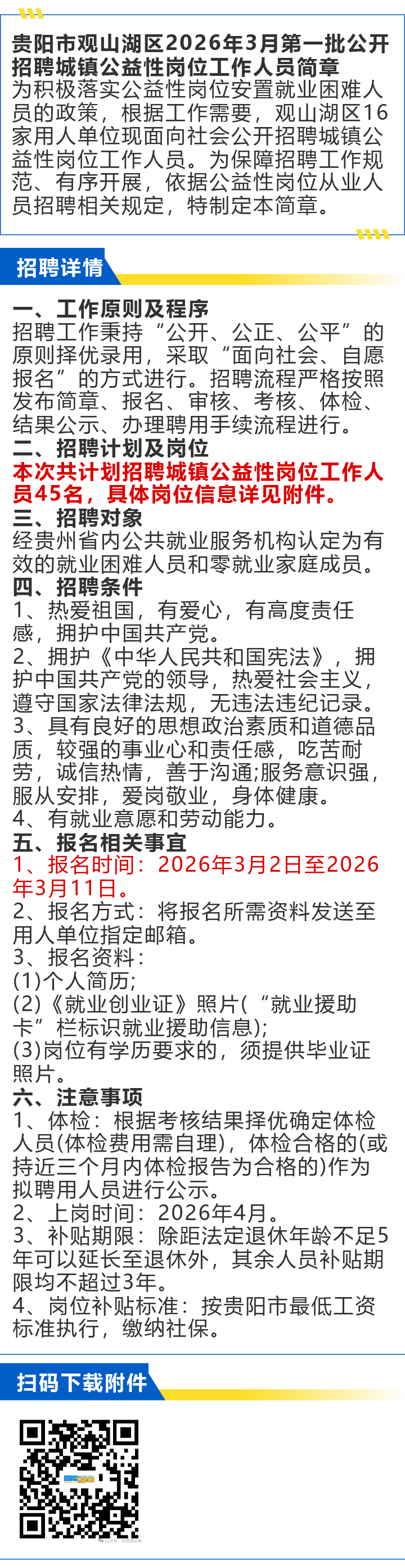 贵阳市观山湖区招聘城镇公益性岗位工作人员45名!报名截止时间:3月11日!