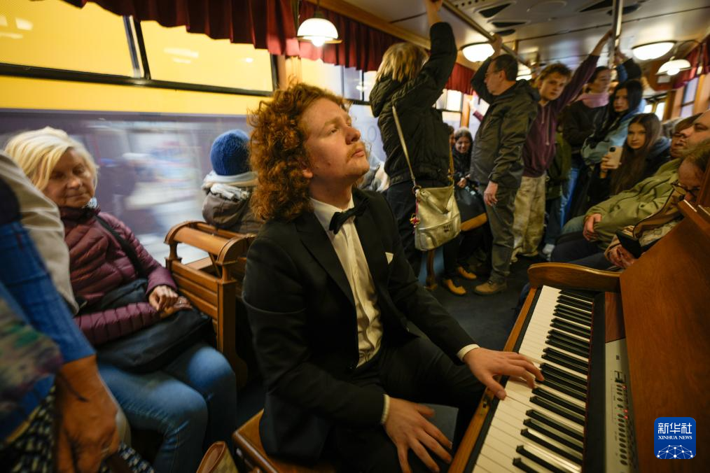 在波兰华沙的“肖邦电车”上,一名钢琴家为乘客演奏肖邦作品。新华社发(亚普·阿林摄)