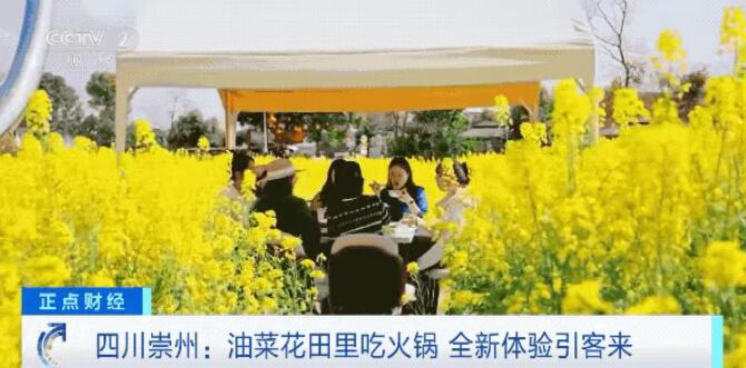 在四川成都崇州,10万亩油菜花进入最佳观赏期,一种“美食+美景”的全新体验正在流行。滚烫的川味火锅分散在花海之中,游客可以一边欣赏一望无际的金色花海,一边品尝热气腾腾的麻辣火锅,搭配“就地取材”的油菜薹、蜂蜜水。香味、甜味、麻辣味互相萦绕,既有带得走的春日的甜,也有尝尽嘴里的鲜。