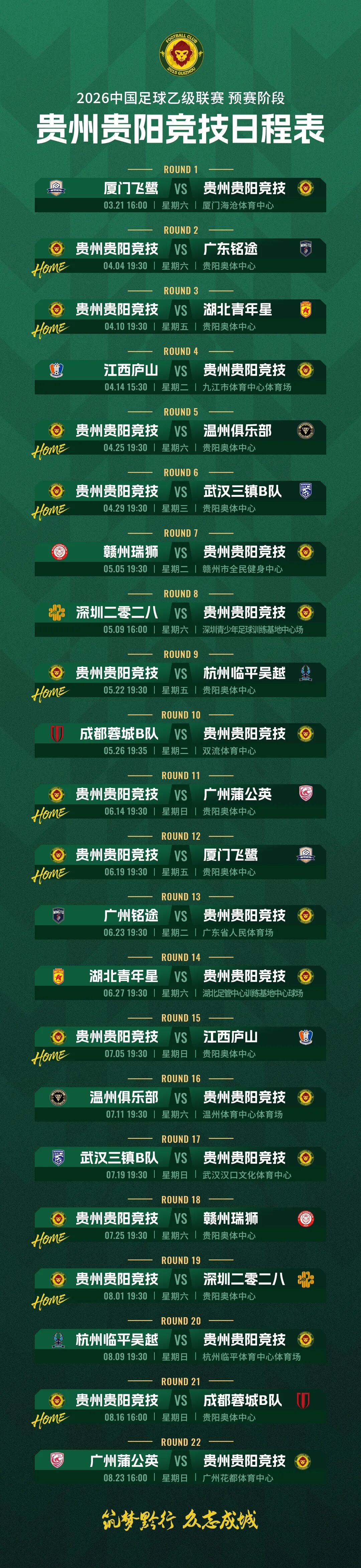 2026赛季中乙联赛预赛阶段贵州贵阳竞技赛程