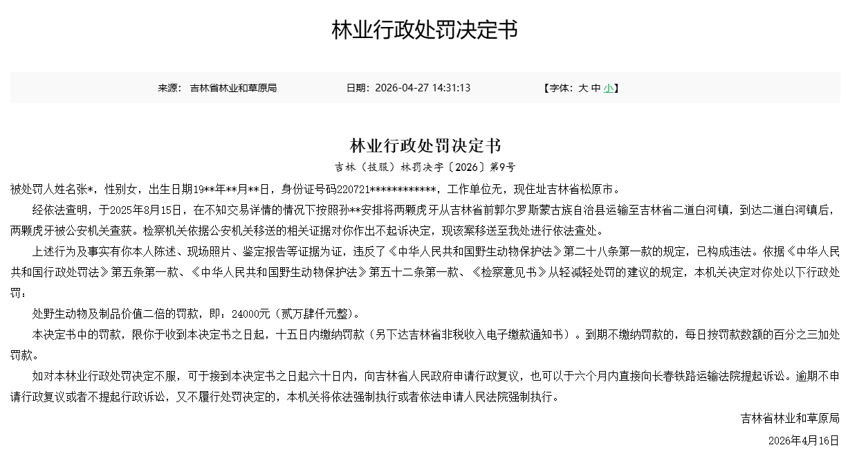 另一份《林业行政处罚决定书》显示,张某,女,工作单位无,现住址吉林省松原市,经依法查明,2025年8月15日,其在不知交易详情的情况下按照孙某某安排将两颗虎牙从吉林省前郭尔罗斯蒙古族自治县运输至吉林省二道白河镇,到达二道白河镇后,两颗虎牙被公安机关查获。检察机关依据公安机关移送的相关证据对张某作出不起诉决定。